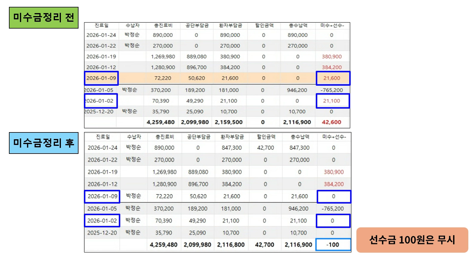 [미수금 정리 전/후]