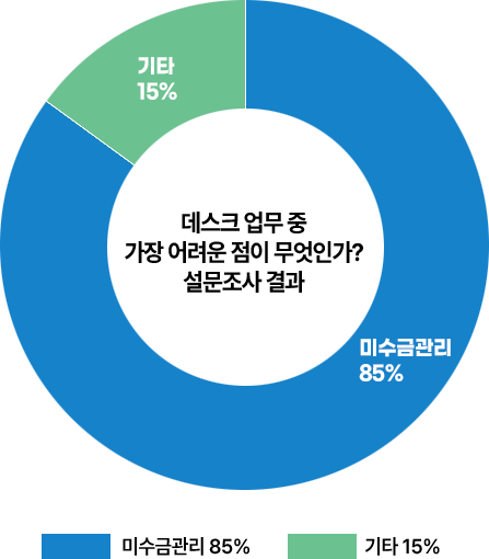 수납 업무에서 어떤 부분이 가장 어려운지 설문 조사 시 응답자 85% 이상이 미수금 관리를 꼽았어요.